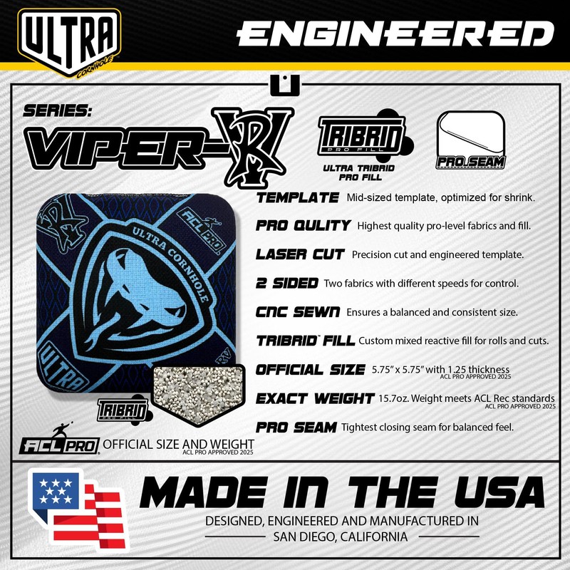 - Two different fabrics: Ultra Cornhole's Viper-RV bags utilize two unique fabrics to optimize game play. The fast side is made for speed and durability. The hybrid-carpet slow side is perfect for cutting and rolling bags.
