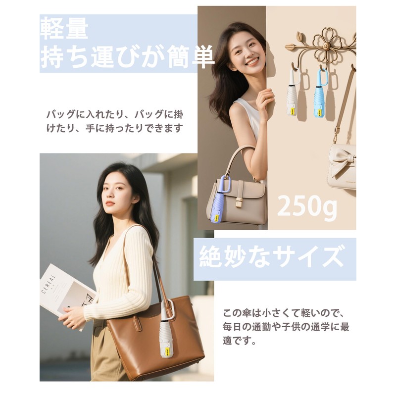 - MINI TRAVEL SIZE - This folding umbrella is only 25cm long and weighs only 250g. Small and portable and easy to put in your purse, briefcase, backpack, suitcase, car and so on, it provides great convenience for activities such as flower viewing, fall leaf hunting, beach play, hot spring travel, golf, outdoor hiking, camping, walking, fishing, climbing etc. It also fits perfectly in the convenient store umbrella holder, so you don't have to worry about annoying around you when it rains