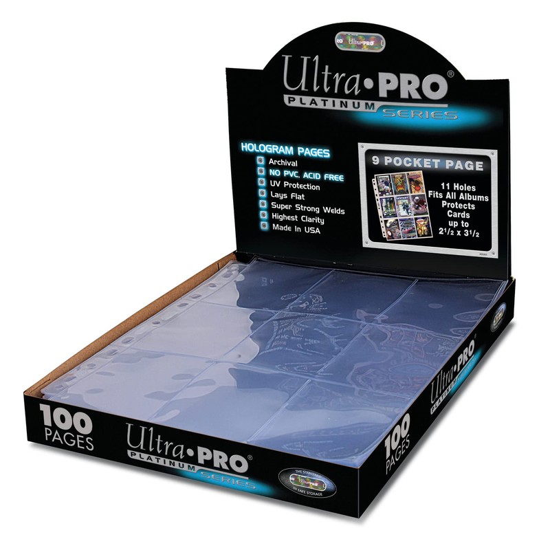 Amazon.comThe Ultra Pro 9-Pocket Trading Card Pages provide a way for you to display and protect your favorite trading cards in any standard three-ring binder. Coming in a box of 100, each page holds nine 2.5 by 3.5-inch trading cards. The top-loading pages are constructed of polypropylene that is PVC and acid-free and offers UV protection to keep your cards in perfect condition. With strong seam welds, the durable heavy-weight pages are made for long lasting use.Product DescriptionThe Ultra Pro 9-Pocket Trading Card Pages provide a way for you to display and protect your favorite trading cards in any standard three-ring binder. Coming in a box of 100, each page holds nine 2. 5 by 3. 5-inch trading cards. The top-loading pages are constructed of polypropylene that is PVC and acid-free and offers UV protection to keep your cards in perfect condition. With strong seam welds, the durable heavy-weight pages are made for long lasting use.