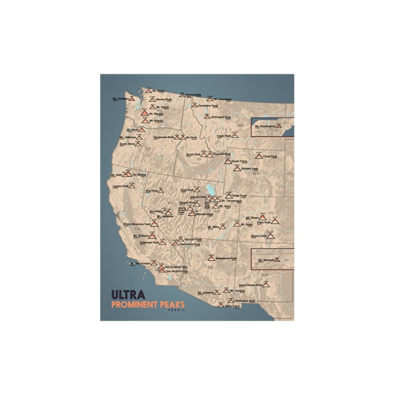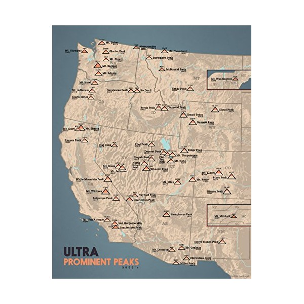 Ultra Prominent Peaks Checklist Map 11x14 Print - 48 states (Tan & Slate Blue)