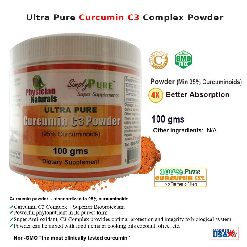 - Ultra Pure Turmeric Curcumin Powder 100% Pure. Patented Curcumin C3* in powder form, Free of sugar, salt, starch, yeast, wheat, gluten, corn, soy, milk, egg, shellfish, Preservatives or processing ingredients.