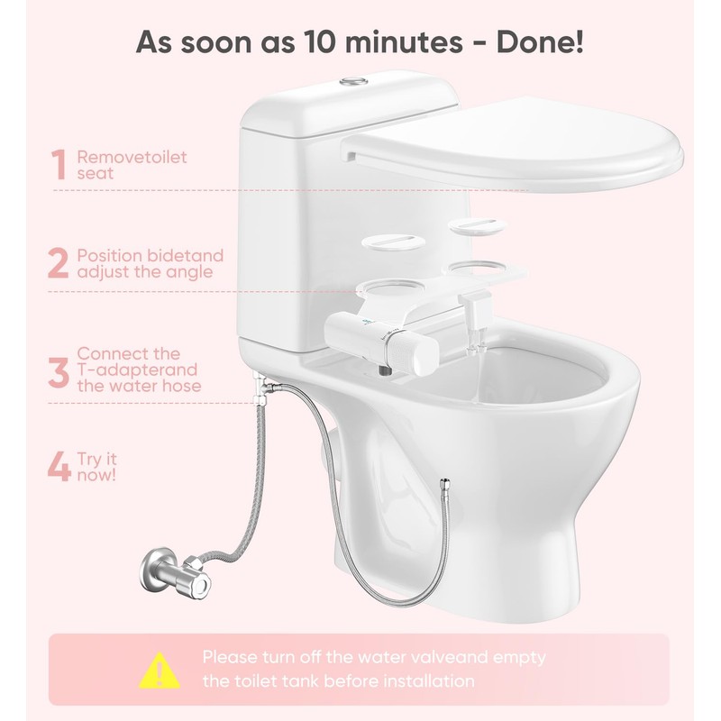 - Easy Installation: Supplied with all the necessary parts to use when installing the bidet. It can be installed in as little as 10 minutes! It does not require electricity to start! PS: Before installation you can refer to the installation video on our webpage.