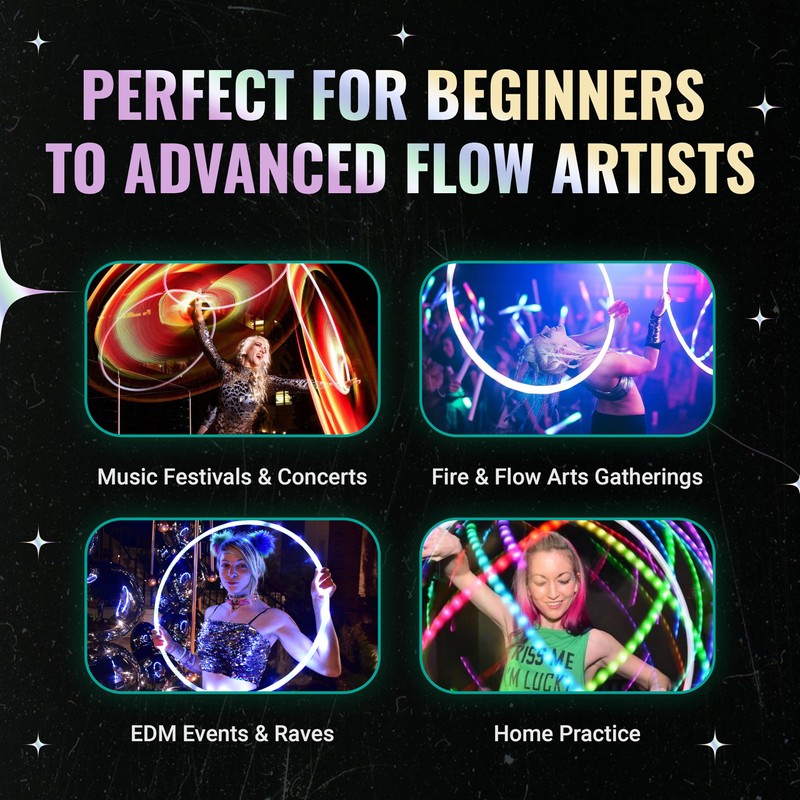- Fun for All Skill Levels: Create a stunning LED light show at home, music festivals, or parties! Whether you're a flow arts beginner or a seasoned pro, this hoop is ideal for honing your skills, exercising and physical coordination. It also makes an excellent gift for all ages!