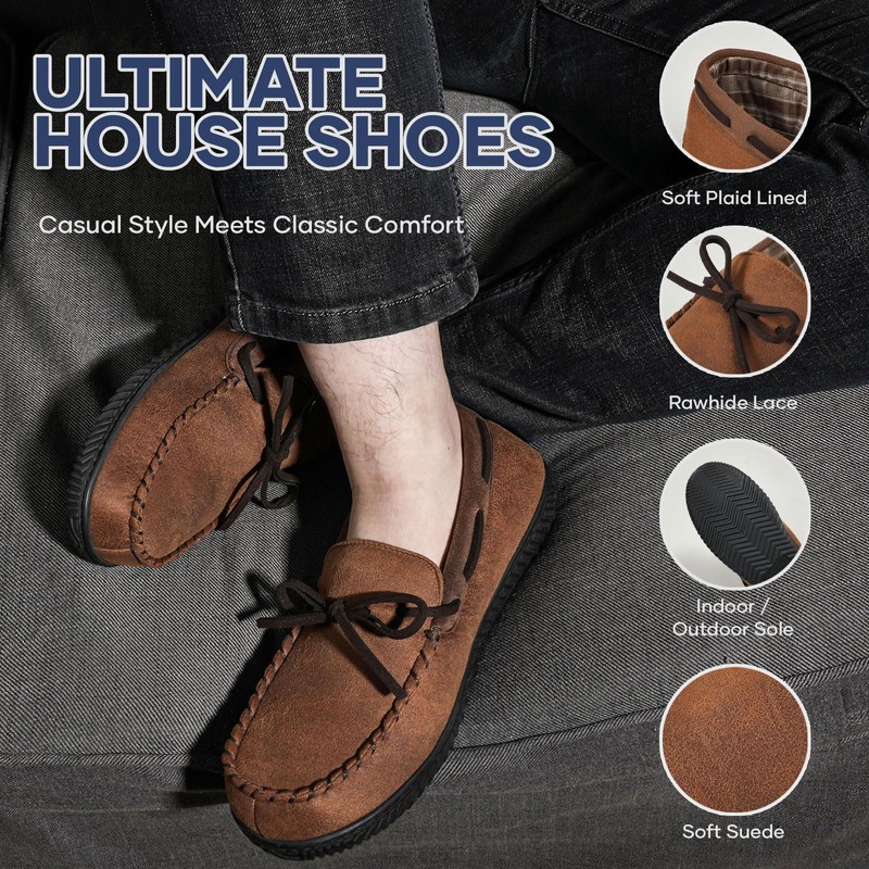 - Classic style: These moc slippers made of faux suede upper and plaid cloth lining which wicks away moisture to keep your foot dry and odorless.