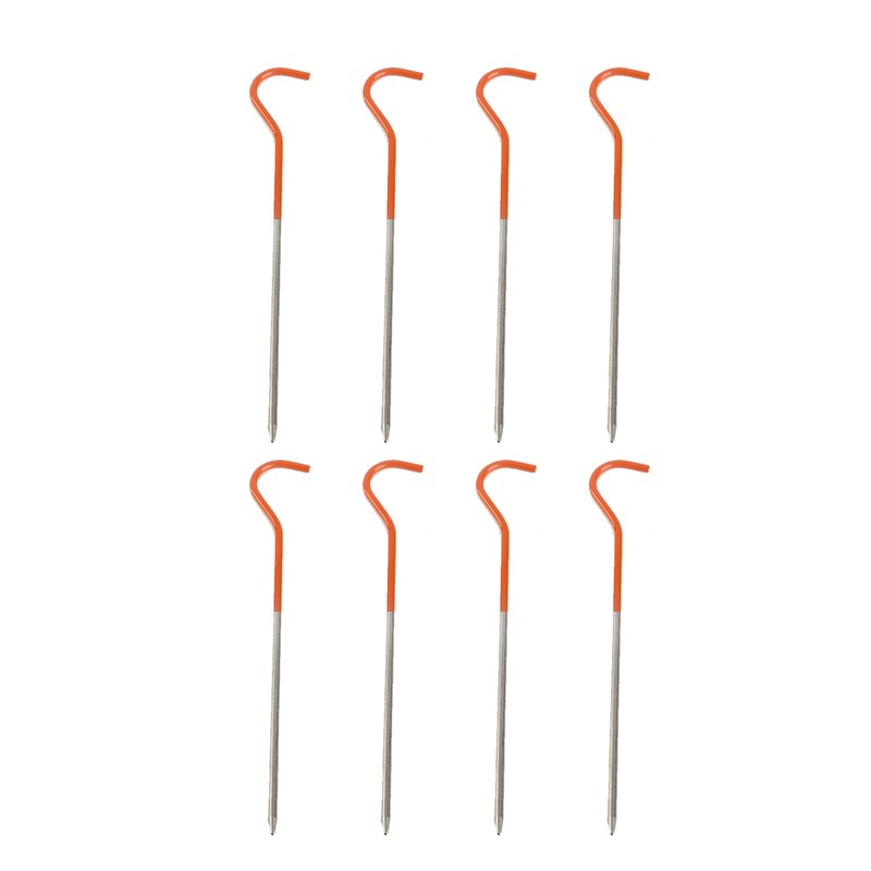 1、Made from alloy, high strength and ultralight. 2、Tapered tips makes it easy down to the soil. 3、Easy to pull out the stake with the hook design. 4、Orange coating provides good visibility. 5、Great accessory that stabilizes your tent.