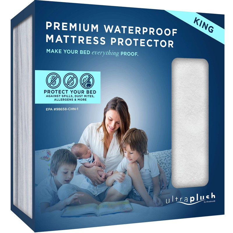 Our Super Soft, Noiseless, 100% Waterproof Mattress Protector Stops Leaks, Protect your mattress from spills and accidents with our new, super soft, noiseless mattress pad. Most other mattress protectors are made with a terry cloth surface that isn’t very soft or comfortable. Our new UltraPlush Mattress Protectors are plusher & softer and won’t change the feel of your mattress. Ultra-Powerful 100% Waterproof Membrane Protects Your Mattress from Liquids of All Types * Spilled drinks * Bedwetting * Incontinence * Perspiration* Not just water resistant, but waterproof Ultra Plush Micro-Velour Fibers are More Comfortable than Terry Cloth Protectors * Super soft fibers naturally absorb moisture * NO crinkling noises when moving in bed * Does NOT feel like plastic & won't change the feel of your mattress * Fitted sheet style elastic sides fit up to 18” thick mattresses including deep pocket * Machine washable for easy cleaning King Size. Select Your Mattress Size and Order our Best Mattress Protector Ever!