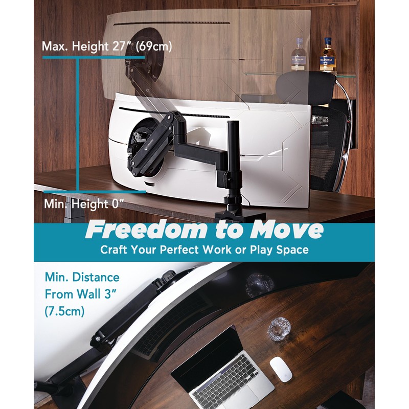- Fits Ultra Wide Monitors - Holds one screen weighing up to 44 lbs. Fits ultrawide monitors up to 57" and downward compatible 49" to 24" flat, curved up to 1000R screens. The quick-release VESA bracket has 75x75mm and 100x100mm mounting capability.