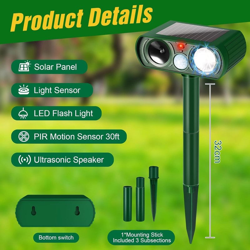 - Solar powered and waterproof design: This Ultrasonic Cat Deterrent relies on the solar panel at the top to charge during the day and can be used at night, which is efficient and low cost, and has IPX4 waterproof function to adapt to all weather conditions.