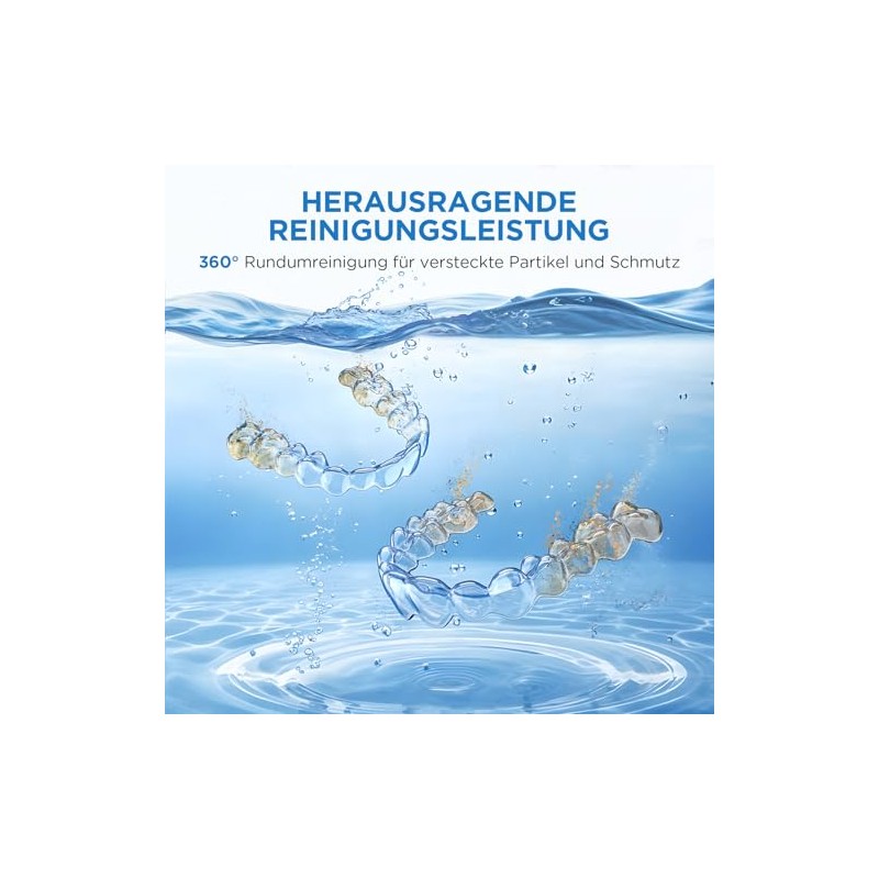 - Two cleaning modes: the ultrasonic tooth rail cleaning offers two programmable cleaning levels, which can be easily changed at the touch of a button: I. Quick cleaning 5 min. Combines ultrasonic waves with UV light for daily basic care. II. Deep cleaning 10 minutes. Uses pulsating ultrasonic technology 2 seconds. Active phase / 1 sec. Pause interval with UV accompanying irradiation to remove even stubborn deposits in microstructures thanks to optimised cavitation pulses