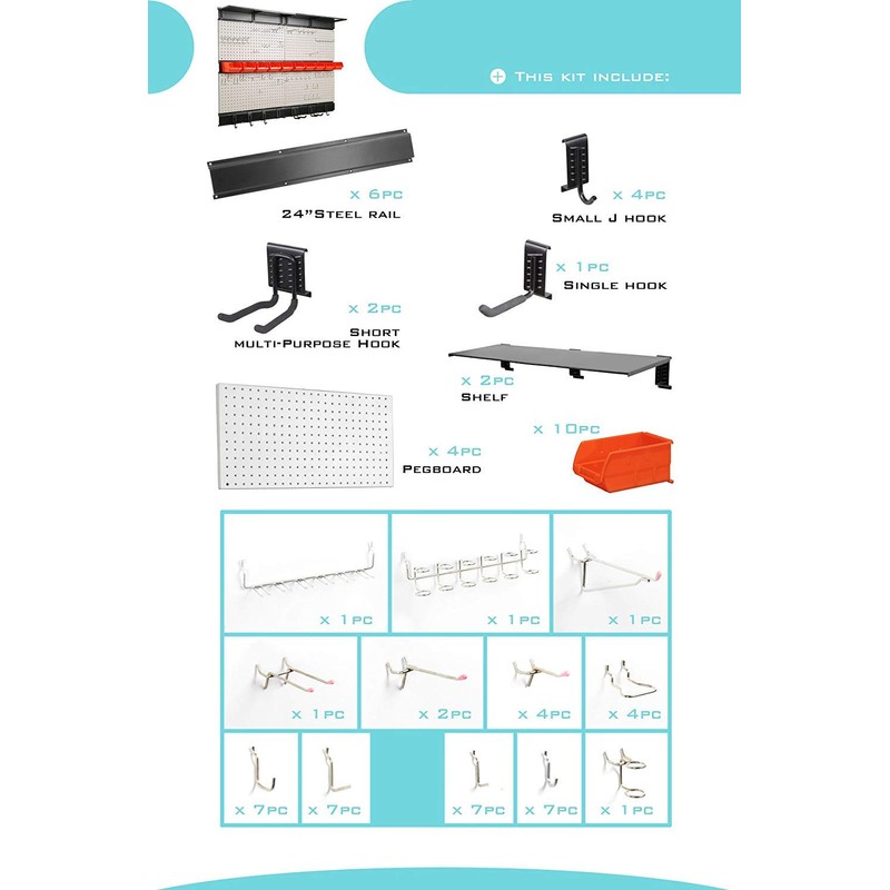 - MULTIFUNCTIONAL & HANDY—This garage storage pegboard system includes 4PC*Pegboard, 6PC*Steel Rail, 2PC*Shelf, 4PC*Small J Hook, 2PC*Short Multi-Purpose Hook, 1PC*Single Hook, 10PC*Garage Storage Bin, 43PC*Mini Hooks. Different styles of hooks meet your diverse needs. Quickly and easily snaps securely into place on mounting rails (included) with provided locking gripper