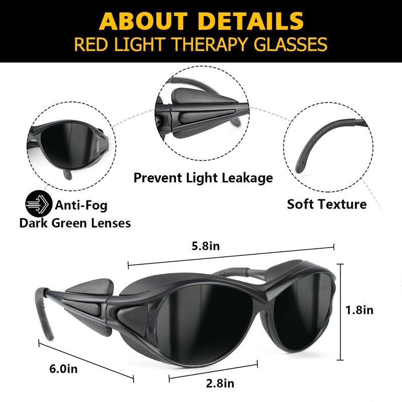 - [Red Light Therapy Glasses] : When receiving red light therapy, red light protective glasses can prevent direct red light and infrared from causing damage to the eyes, eyes protection from 200~2000nm red light and infrared.The eye frame and side wings with soft natural rubber baffle, which can protect your eyes in all directions.