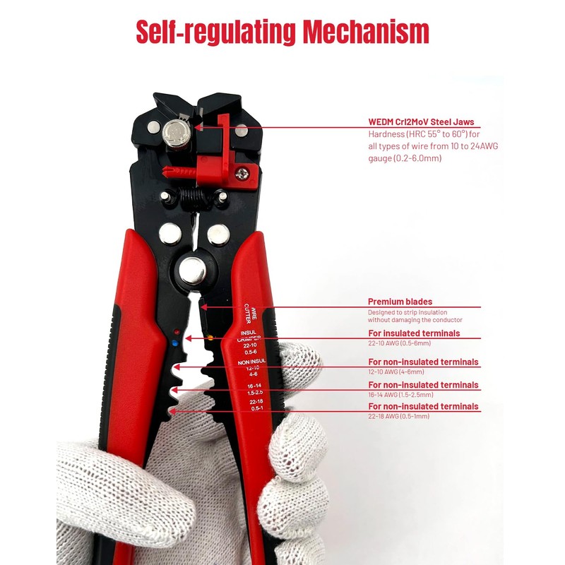 - 3-in-1 functionality to strip, cut, crimp all wires with ease