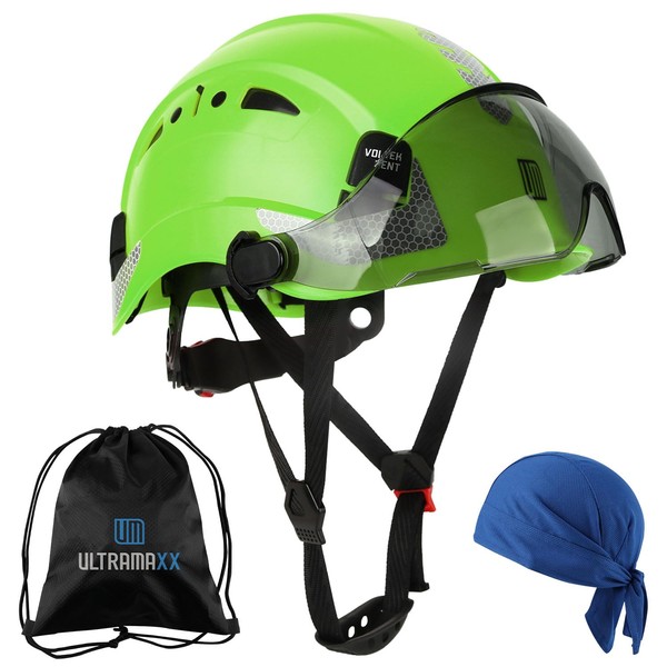 UM ULTRAMAXX Safety Helmet Hard Hat, ANSI Z89.1 Approved Lightweight Vented Work Helmet, 6-Point Adjustable Ratchet Suspension Hardhat for Industrial and Construction (Green+Tinted Visor)