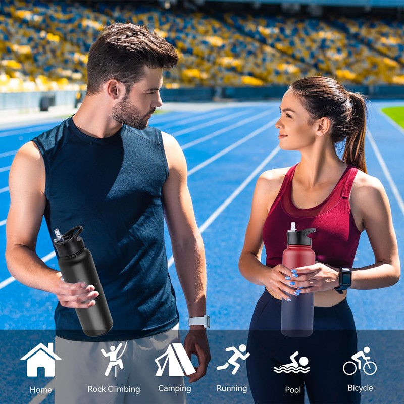 - High quality: the insulated water bottle is made of food-safe, non-toxic 18/8 stainless steel with double wall, it is BPA-free and non-toxic. It will never leave a metal taste or rust. And the powder coating on the outside provides a better grip, and the large opening makes filling and cleaning easy and fast