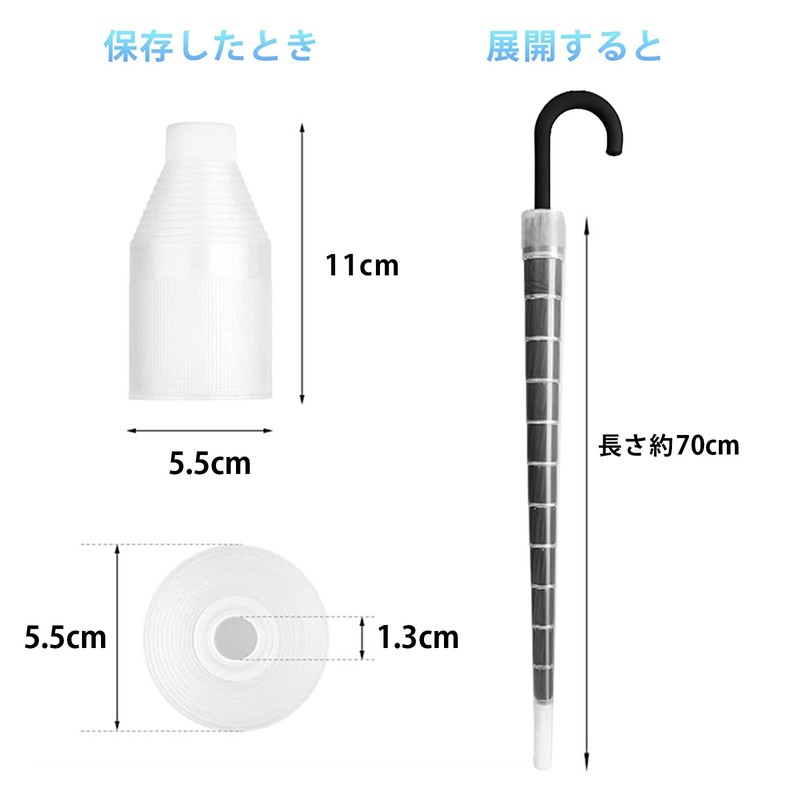 - Size: Length: Approx. 27.6 inches (70 cm), Maximum Diameter: Approx. 2.2 inches (5.5 cm), Minimum Diameter: Approx. 0.5 inches (1.3 cm). Material: Plastic for 8 ribs long umbrella