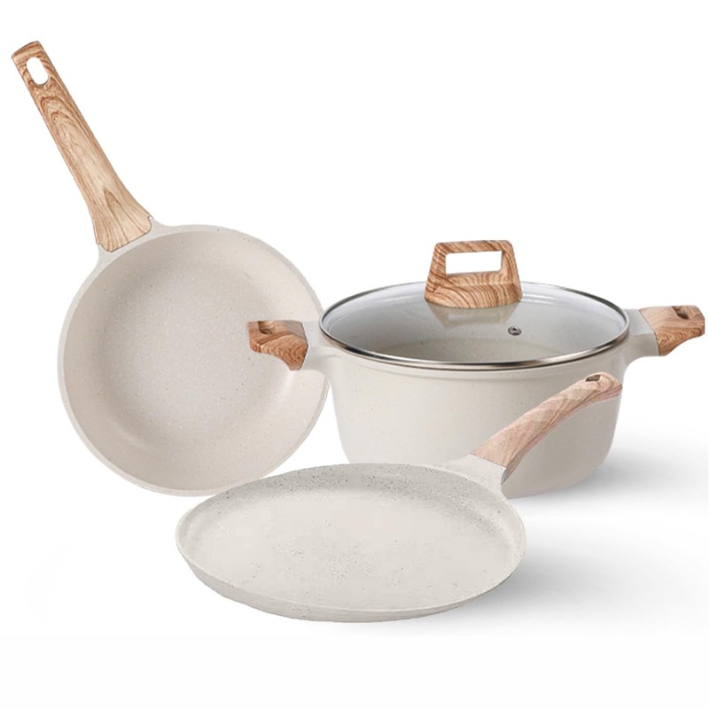 - 【Complete Cooking Set】UMETRE 4 Pcs Pans and Pots Set Includes: 9.45 inch frying pan, 6QT casserole pot with lid, 9.45 inch Crepe Pan. This nonstick cooking set meets your daily cooking needs!