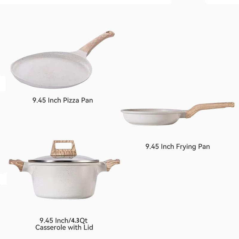 【Eco-friendly Non-Stick Granite】Our cookware set interior is coated by non-stick granite coating. Require less oil or butter for cooking and minimal scrubbing for a spotless clean, giving you a healthier and more enjoyable at-home cooking experience.