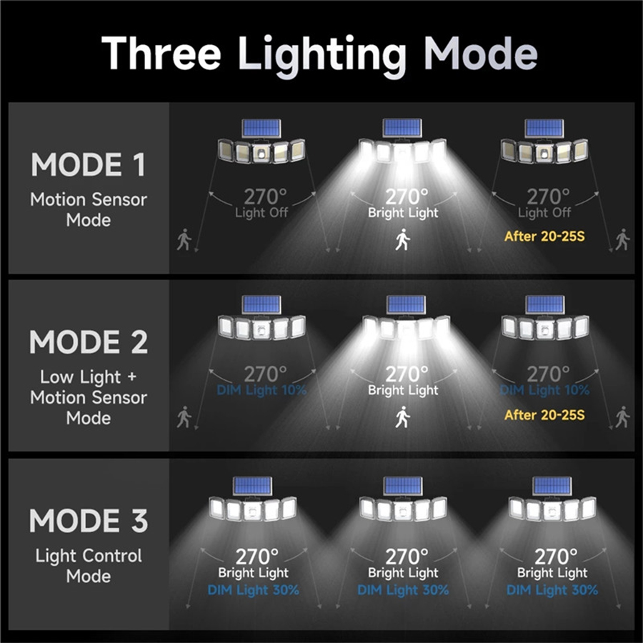 3 Working Mode Available: Mode 1: When people come, the light turns on at 100% brightness, and the light turns off 20 seconds after people left; Mode 2: When people come, the light is at 100% brightness, and it is always on at 10% brightness 20 seconds after people left; Mode 3: The light always stays on at 50% brightness at night without motion detection.