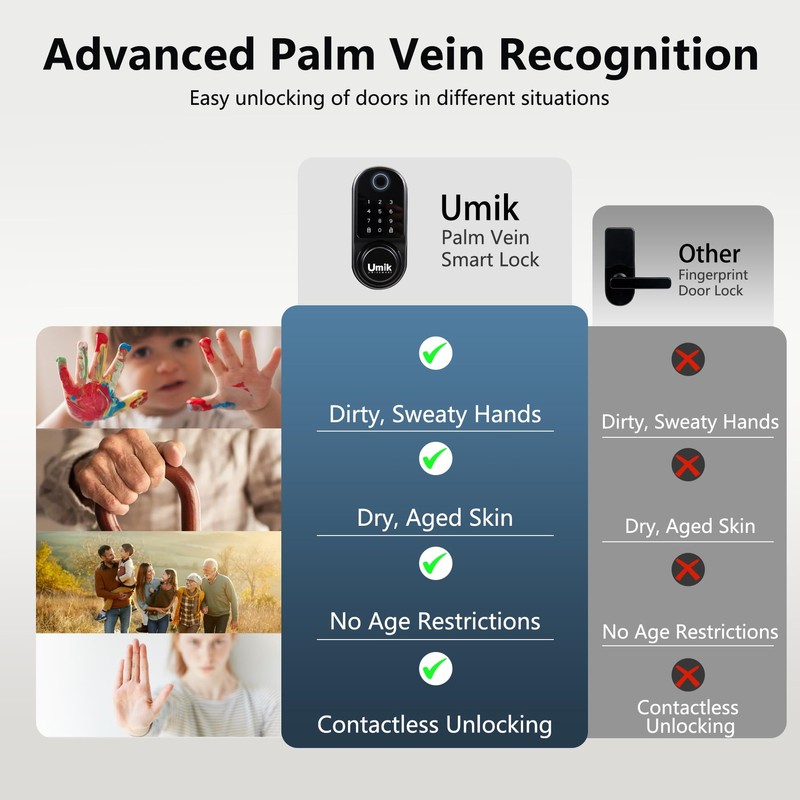 - 【Effortless Access for Everyone】Ideal for all ages, this digital smart door lock ensures seamless entry even with dry, sweaty, or stained hands. Forget fingerprint errors—our palm vein smart lock uses contactless biometric recognition, making it the perfect smart lock for front doors in busy households or for elderly users and kids