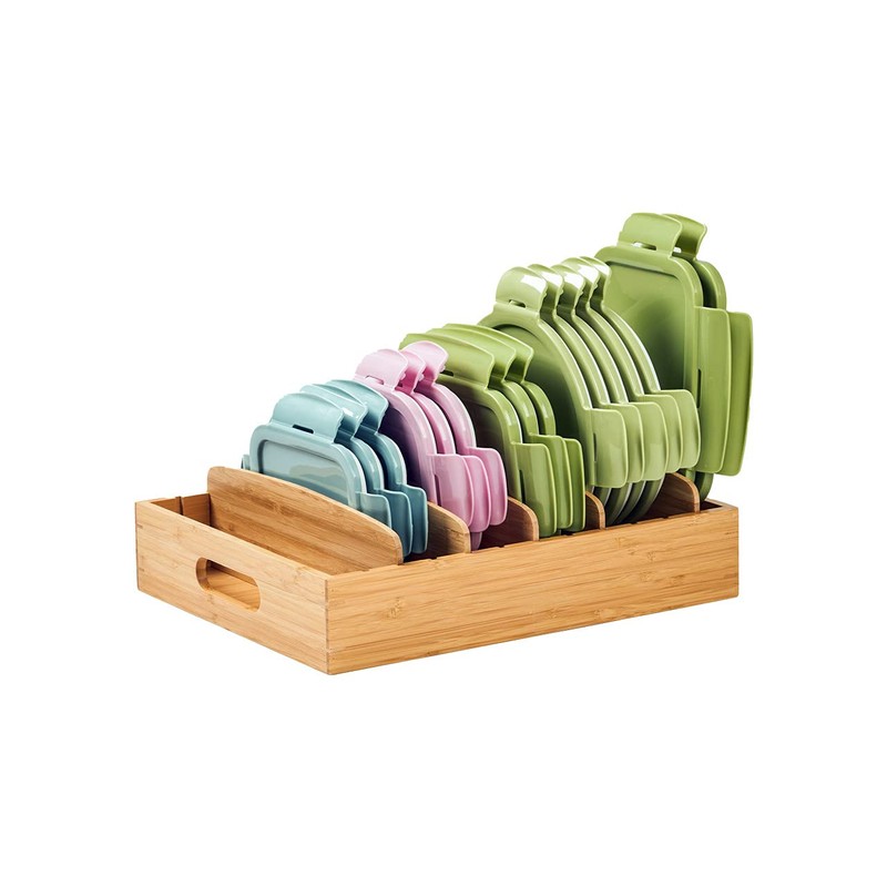 - Food Container Lids Organizer: Made of premium bamboo, especially the bottom of the organizer is quite different from others. Natural even texture, solid construction. Holds food container lids (round, square, rectangular) up to 9.5”.