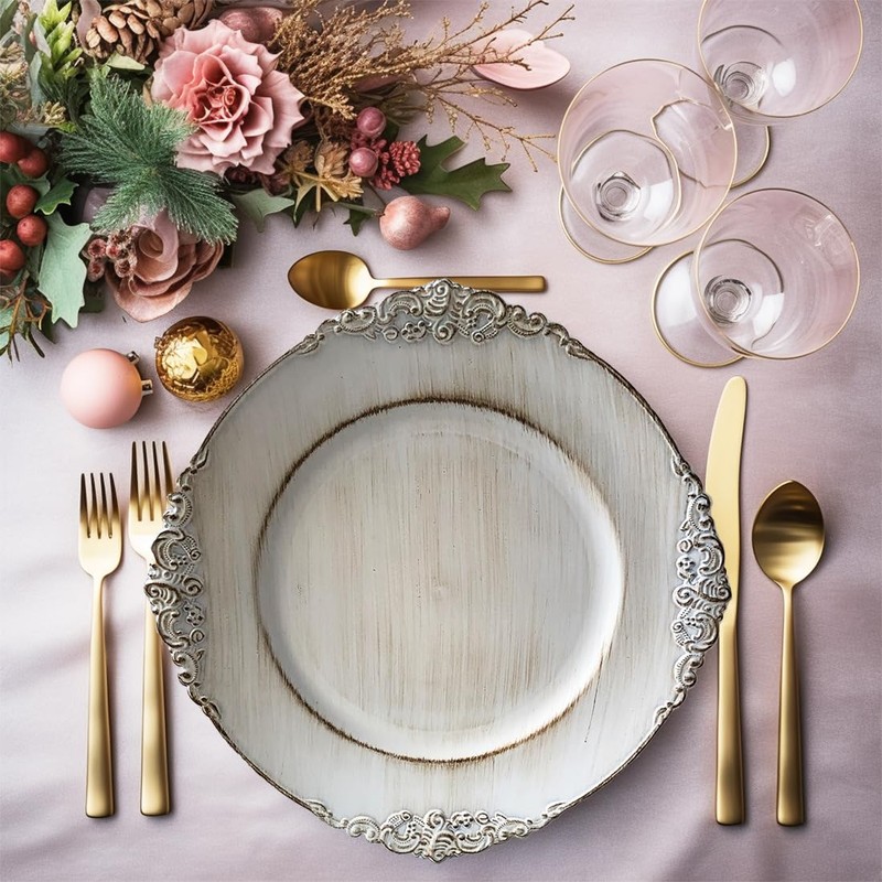 Umisriro Antique White Charger Plates, 13 Inch Embossed Chargers for Dinner Plates. Set of 6 Plastic Charger for Wedding, Party,Elegant Tableware Chargers Decoration.