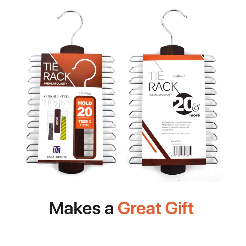 - DURABLE: The high quality finish of the tie rack's wood will not disappoint. The smooth finish to the dark walnut wood adds an added elegance to show off your tie collection. The tie holder will look fantastic in your closet.