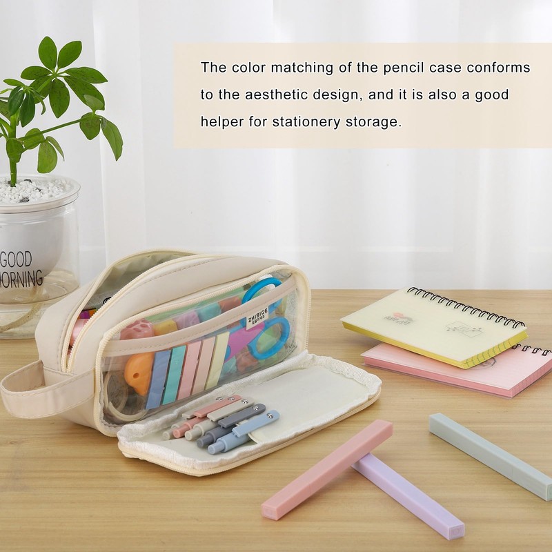 umorismo Big Capacity Pencil Case with Sticky Note Aesthetic Pencil Case for Girls Expandable Pencil Case with Zipper School Stationery Organizer Makeup Cosmetic Bag (Beige)