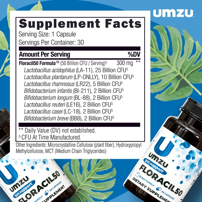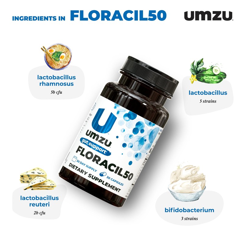 UMZU Floracil50 Prebiotics and Probiotic for Women + Men, 50 Billion CFU for Digestion, Gut Health, Acidophilus, Rhamnousus, Immunity, Energy (30 Capsules)