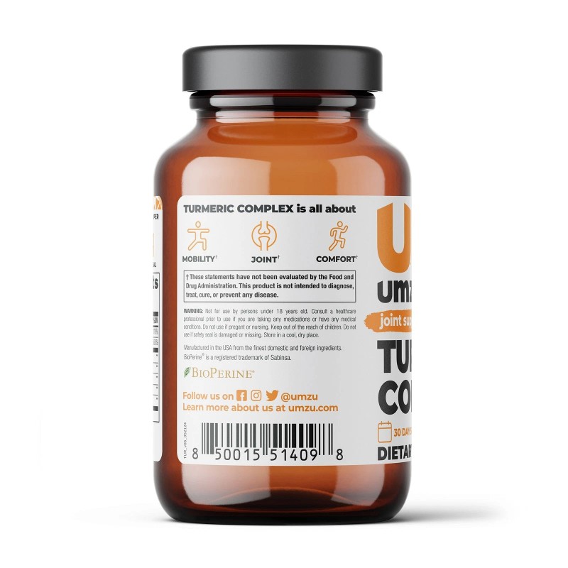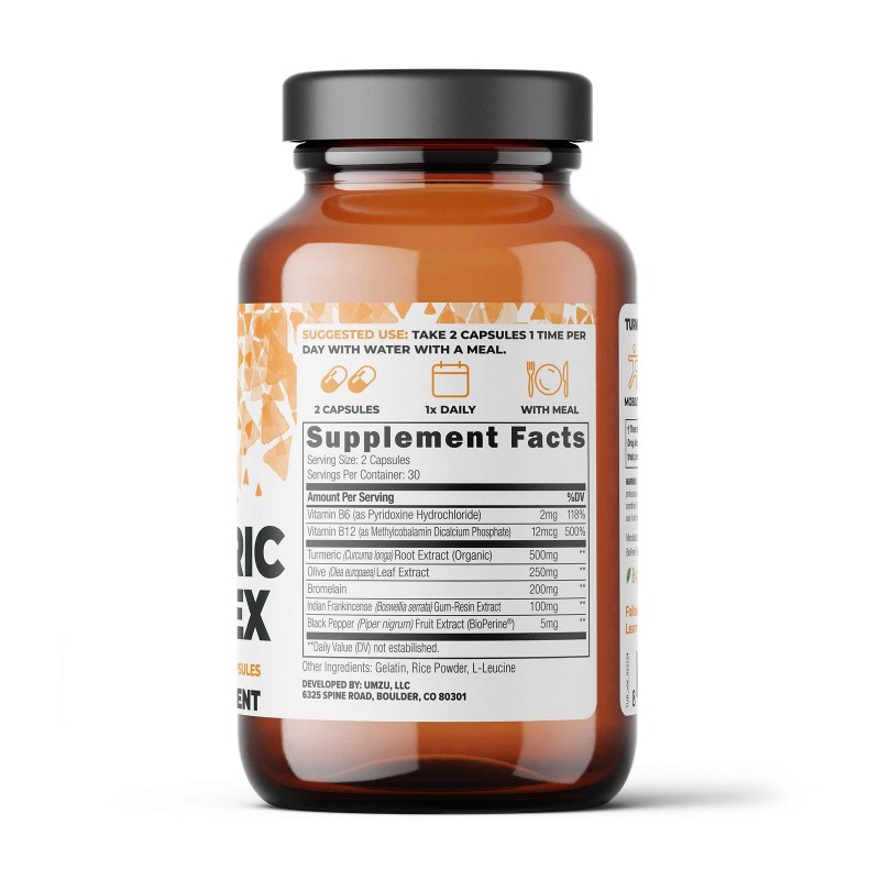 Turmeric Complex is a natural supplement featuring six key ingredients: turmeric, bromelain, olive leaf extract, Indian frankincense, black pepper extract, and B vitamins. This blend supports flexibility, comfort, mobility, gut health, and immune function. Additionally, the components of Turmeric Complex contribute to a healthy stress response.†