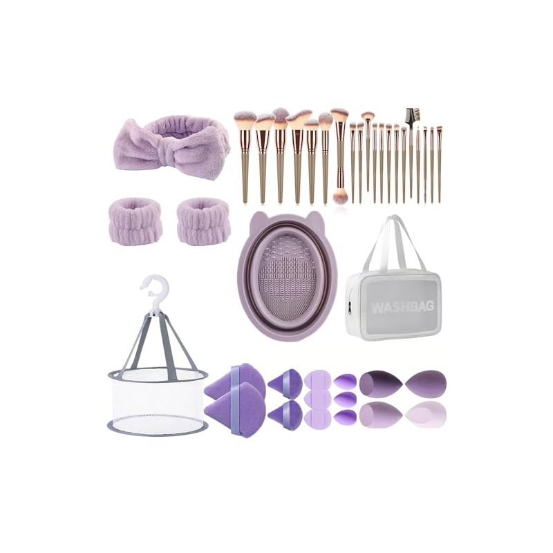🌟 ⭐ Un set de brochas de maquillaje para cara y ojos de 40 piezas que incluye 20 brochas, cinta para el pelo, 2 pulseras, 4 huevos de esponja de belleza grandes y 3 mini, 2 abanicos grandes y 2 pequeños y 3 pulgares, una bolsa, así como un cuenco para limpiar las brochas de maquillaje y una red para secar las brochas de maquillaje.Viajar, guardar, regalar (Purple) ⭐ 🌟
