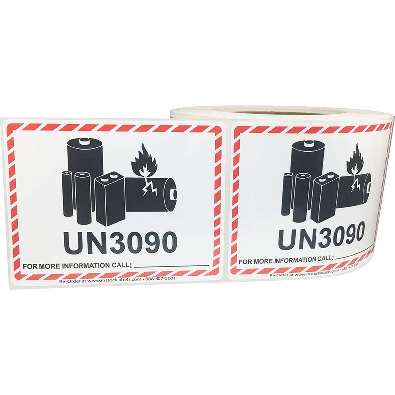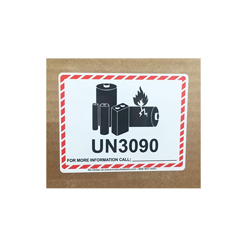 These are UN3090 battery warning labels stickers with an area to write phone number to call about more information. These have a warning logo of a set of batteries showing to be caught on fire. The border will have a red enclosure to show the end of the label. The size of these UN3090 labels is a regulated size of 3.25" x 4.25" and are made with a semi-gloss paper material. We use red and black Eco-friendly inks for the print and the back is a permanent adhesive.