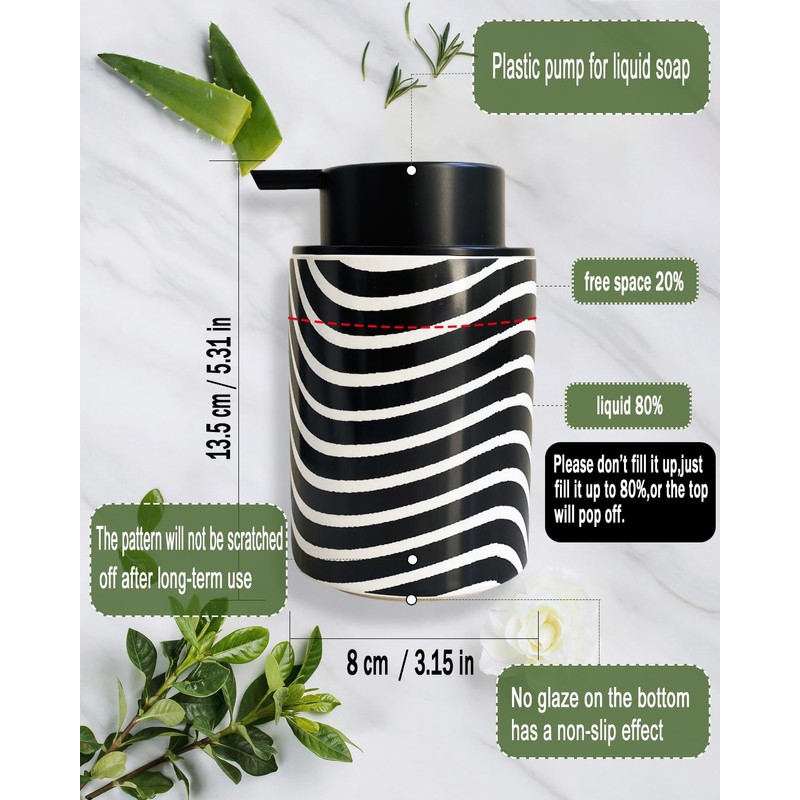 - Plastic Pump and Ceramic Bottle:The bottle of this liquid soap dispenser is made of high-quality ceramic, lead-free, and the matte black pump is made of plastic,and BPA-free.Safe to use.The bottom is non-slip, and it's heavy enough not to tip over easily.