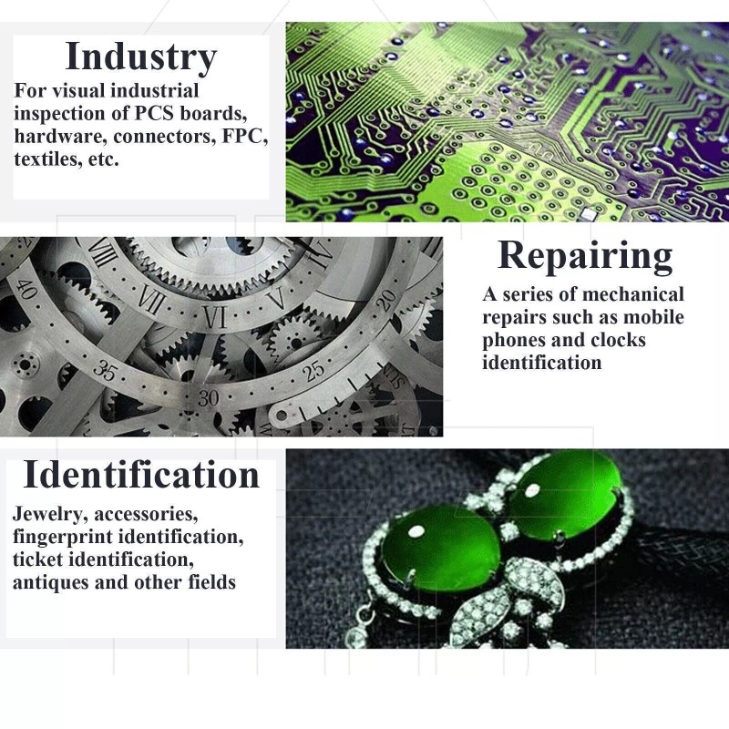 It is suitable for industrial, such as PCB board, hardware, connector, FPC, textile, and other visual industrial inspections, identification use, such as jewelry, jewelry, fingerprint identification, ticket recognition, antiques, and maintenance use, such as cell phones, clocks, watches, and a series of mechanical maintenance. |