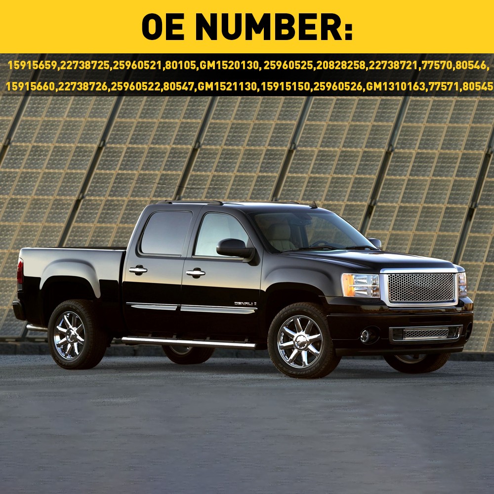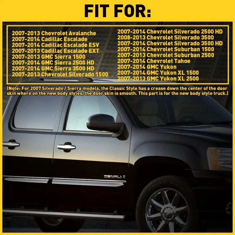 Fits for: 2007-2013 Chevrolet Avalanche 2007-2014 Cadillac Escalade 2007-2014 Cadillac Escalade ESV 2007-2013 Cadillac Escalade EXT 2007-2013 GMC Sierra 1500 2007-2014 GMC Sierra 2500 HD 2007-2014 GMC Sierra 3500 HD 2007-2013 Chevrolet Silverado 1500 2007-2014 Chevrolet Silverado 2500 HD 2008-2013 Chevrolet Silverado 3500 2007-2014 Chevrolet Silverado 3500 HD 2007-2014 Chevrolet Suburban 1500 2007-2013 Chevrolet Suburban 2500 2007-2014 Chevrolet Tahoe 2007-2014 GMC Yukon 2007-2014 GMC Yukon XL 1500 2007-2013 GMC Yukon XL 2500 Note: For 2007 Silverado / Sierra models, the Classic Style has a crease down the center of the door skin where on the new body styles, the door skin is smooth. This part is for the new body style truck.