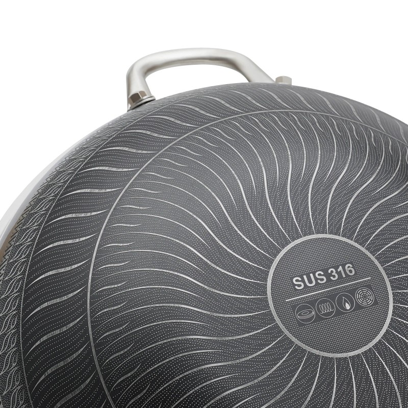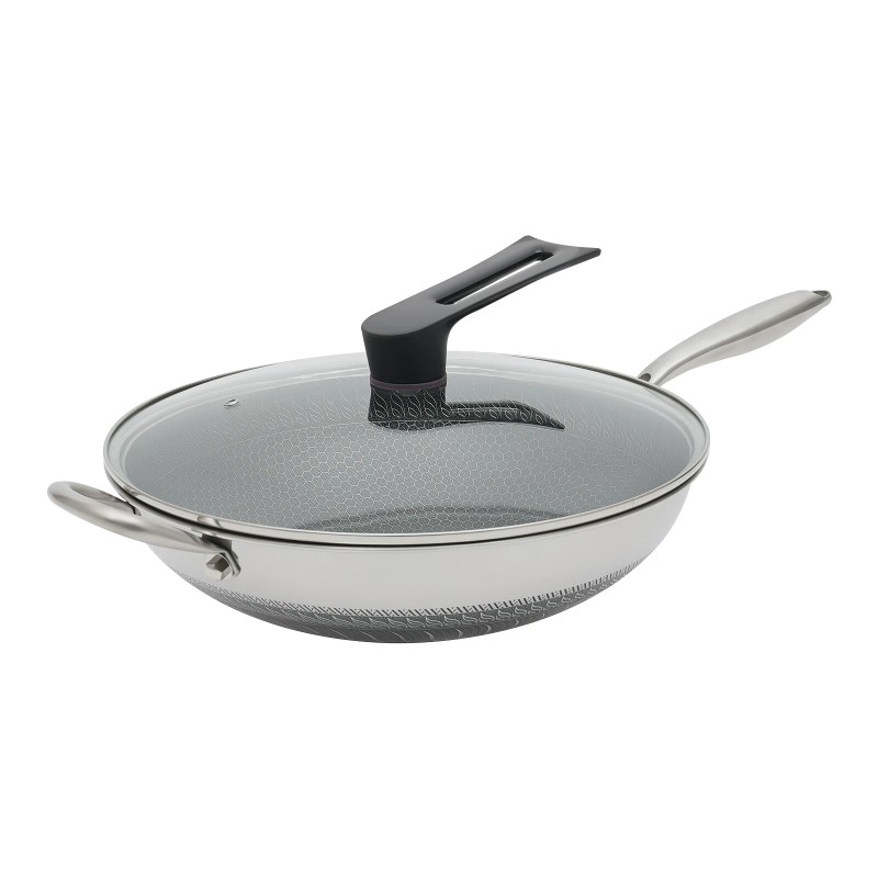 A 34cm Stainless Steel Non Stick Cooking Wok. It Has an Inner Pot Surface with Beautiful Non Stick Coated Honey Comb Pattern. Both Interior and Outerior Consist of Pattern Design. the Pot Also Includes with a Glass Cover Lid. Suited to Cook Meals of Many Kind, It Also Is Easy to Clean. Built with Sturdy Handle for Easy Handling