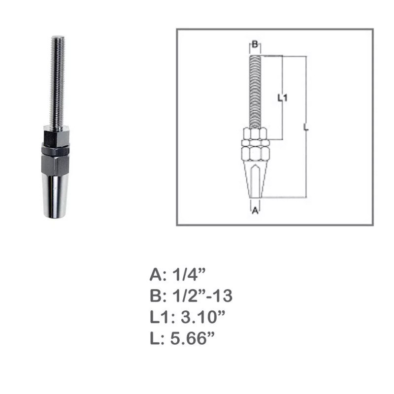 Unbranded 1/4" Swageless Threaded Stud For 1/4" Cable ,1/2" Thread , Stainless Steel T316