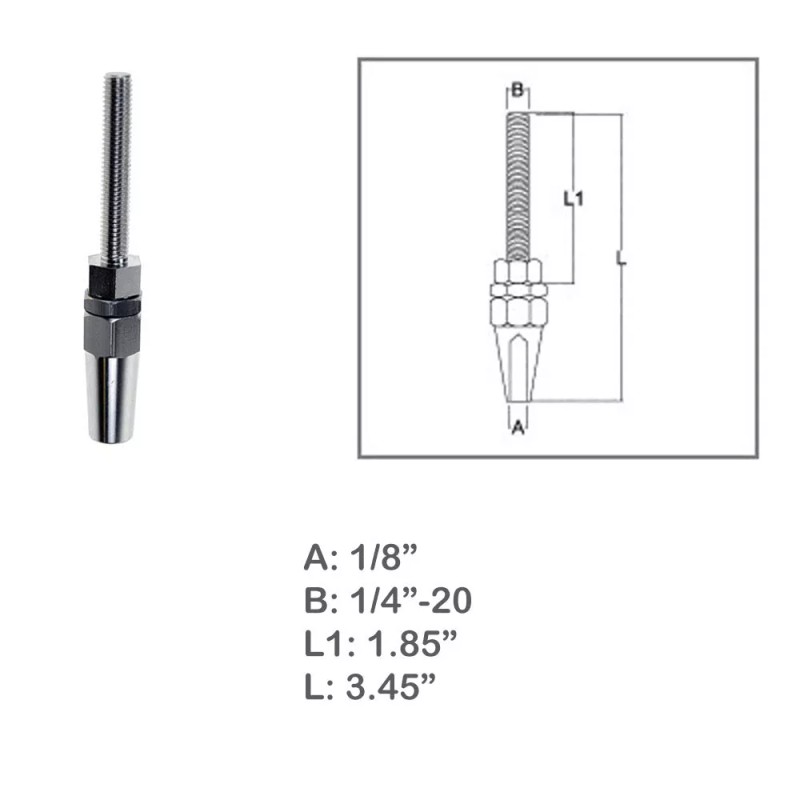 Unbranded 1/8" Swageless Threaded Stud For 1/8" Cable ,1/4" Thread , Stainless Steel 4 PC