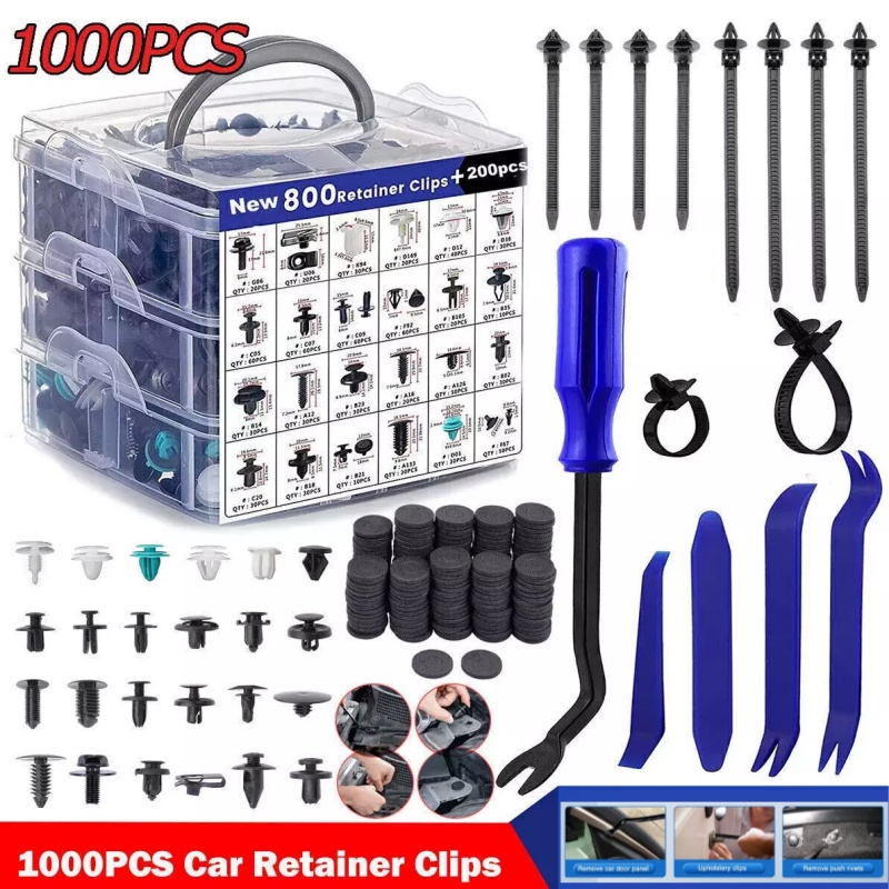 UNIVERSAL AUTOMOTIVE CLIPS KIT: 1000 PCS great assortment push retainer kit including 24 most popular sizes, 4 different kinds tools with 1 Blue Fastener Remover, fitting for door trim, radiator shield yoke, fender, bumper, side skirt, grille, engine cover and splash shield retainers replacement