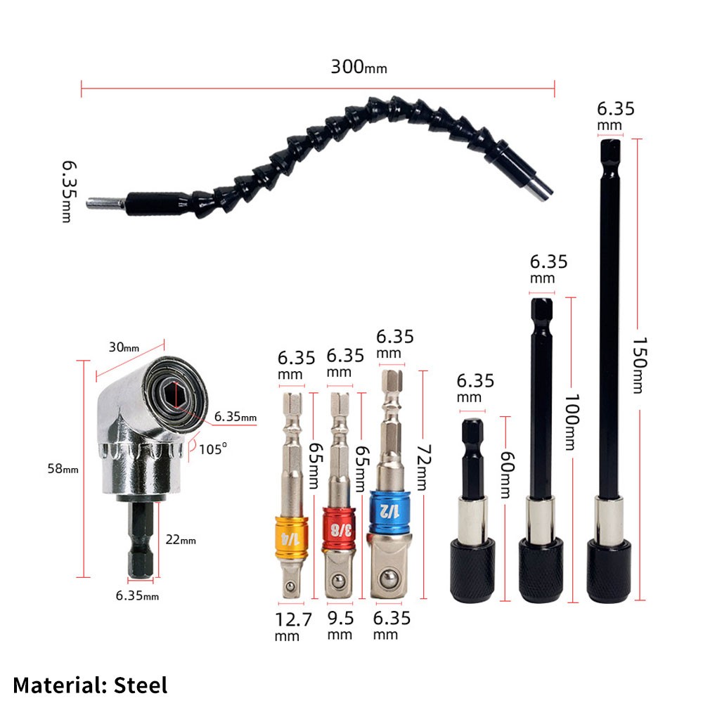 Application:105°Angle 1/4 inch Hex Drill Bit Screwdriver Socket Holder Adaptor,which is quick change compatible and fits most power drill,