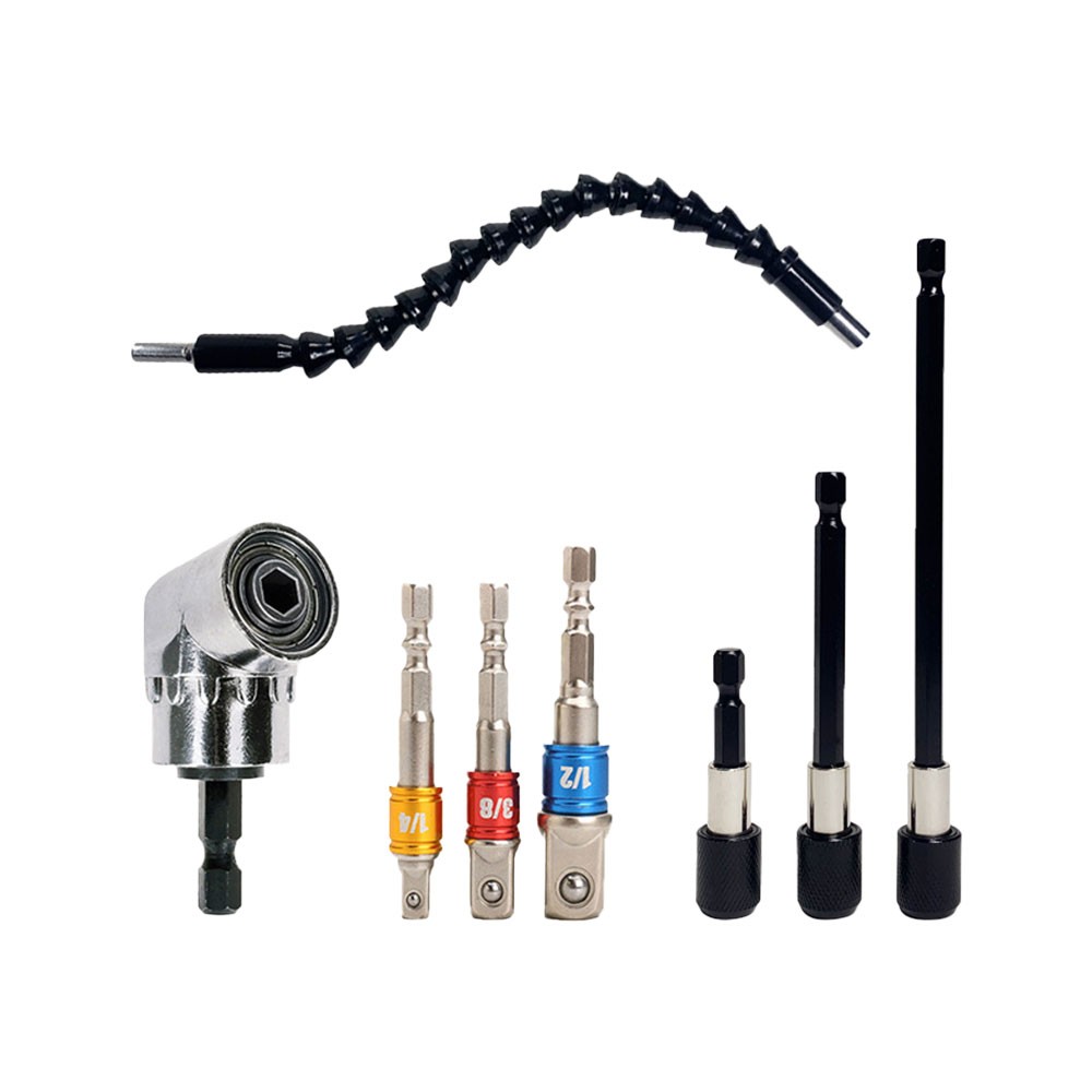Application:1/4 Inch Hex Shank Magnetic Extension Chuck Adapter Quick Release Bar Socket Screwdriver Bit Holder,Suitable for electric, pneumatic screwdrivers and other screwdriver bits of power tools, drill extended. 3Pcs Colorful Socket adapter impact set - 1/4" drive adapter, 3/8" drive adapter, and 1/2" drive adapter and each with a 1/4 inch hex shank driver socket adapter set .Connect impact sockets/socket wrenches/sockets bits/driver sockets to power cordless,Flexible Drill Bit Extension Fits for most power drill and socket wrench.