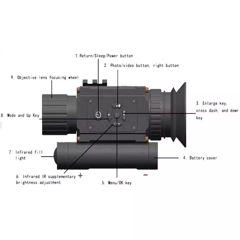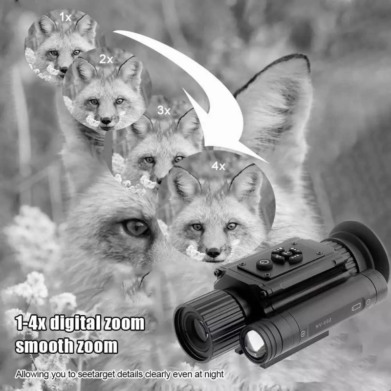 - Magnifying Power1-4XModel No.NV-002IR Wave Length850nmIR Power3WStorage TypeTF Card (Not included)Transmission MethodTF Card Type-C Data CableFocusing3CM-~~IR Illuminate Distance200MPhoto Resolution3072x1728Video Resolution1920x1080Display Resolution454x454Output TypegMP4Frame Rate