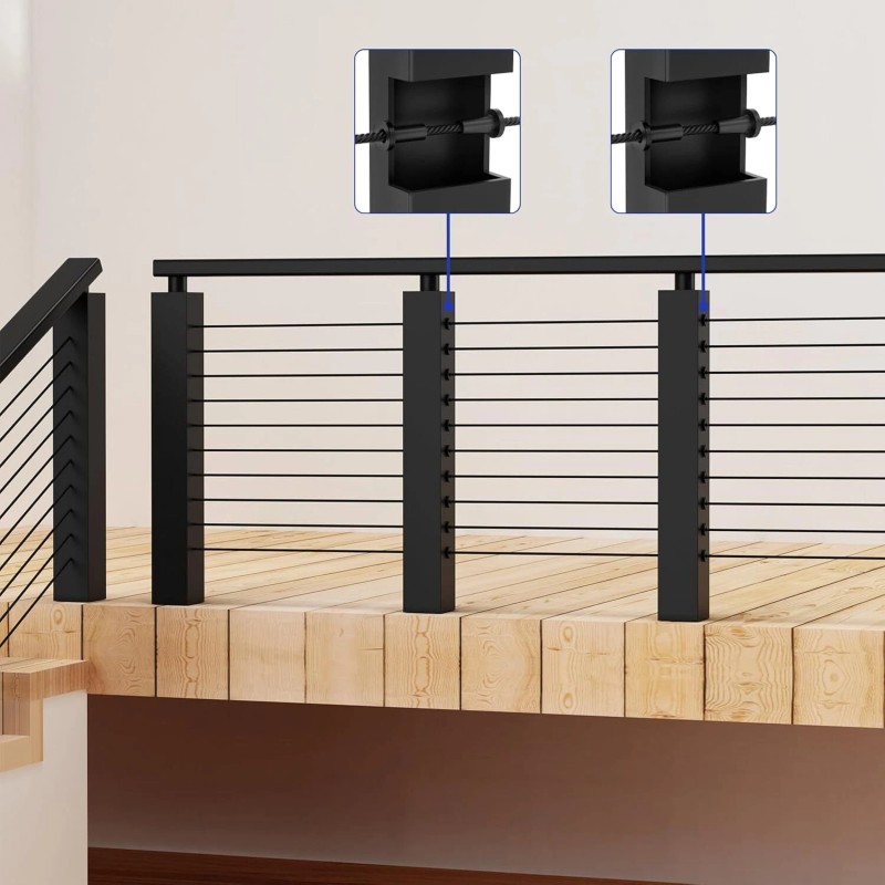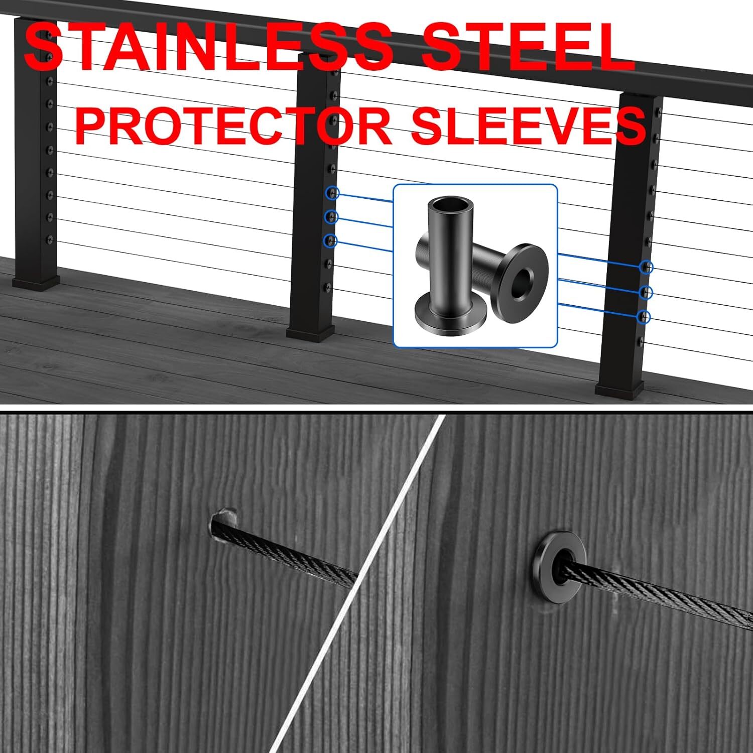 【Material】Black cable railing protector sleeve is made of stainless steel T316 marine grade, High tensile strength and anti-fatigue strength Weatherproof. It is corrosion-resistant which makes our balustrade hardware suitable for coastal installations. Black cable railing system requires hardly any maintenance.
