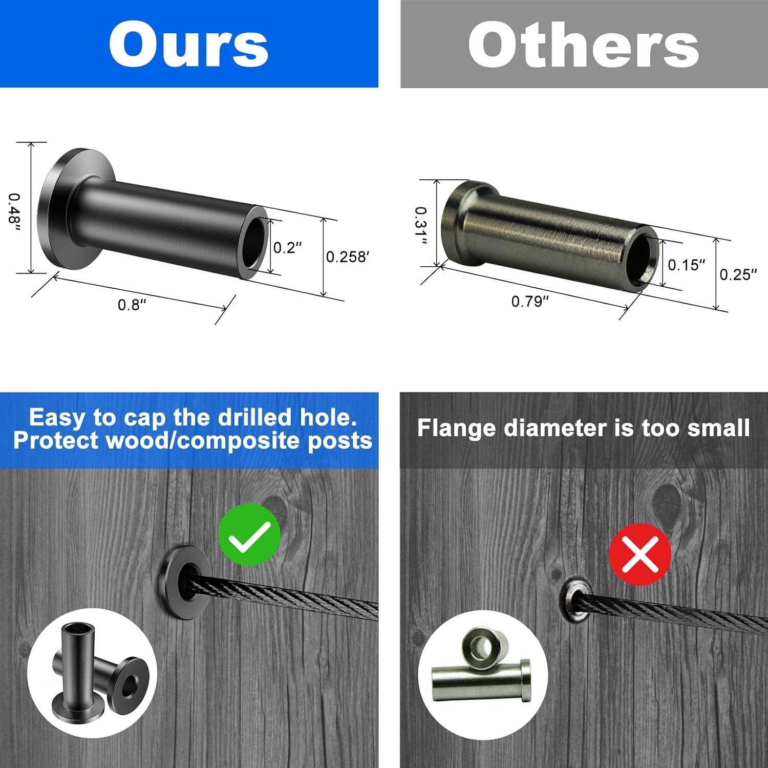 【Size】Overall Length of Sleeve = 0.8 inch, Flange Diameter = 0.48 inch, Required Hole Diameter = 0.258 inch, black cable railing protector sleeves are suitable for 1/8" 5/32" or 3/16" cable railing.