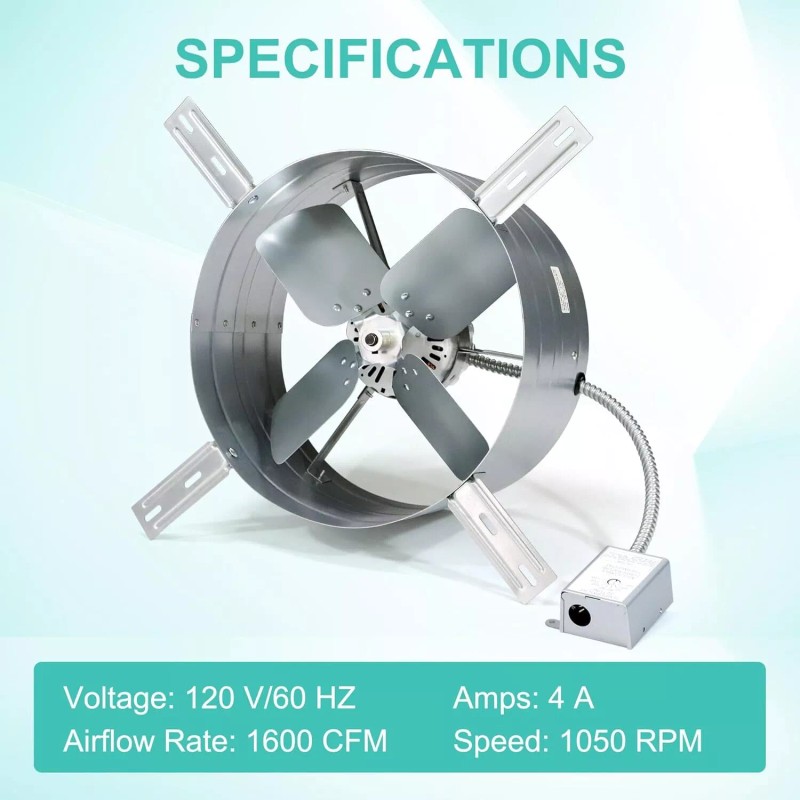 - High Performance Attic Fan - The 1600 CFM Gable Mount Attic Fan is designed to help cool attics of up to 2,400 square feet. This ventilator is powerful enough to effectively circulate air and remove heat from the attic space, creating a more comfortable living environment