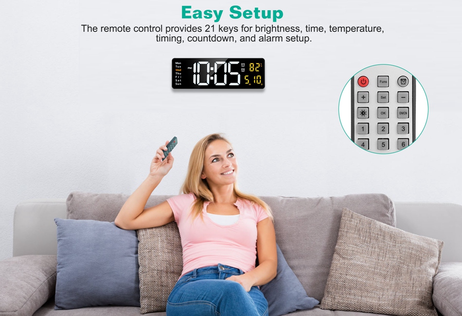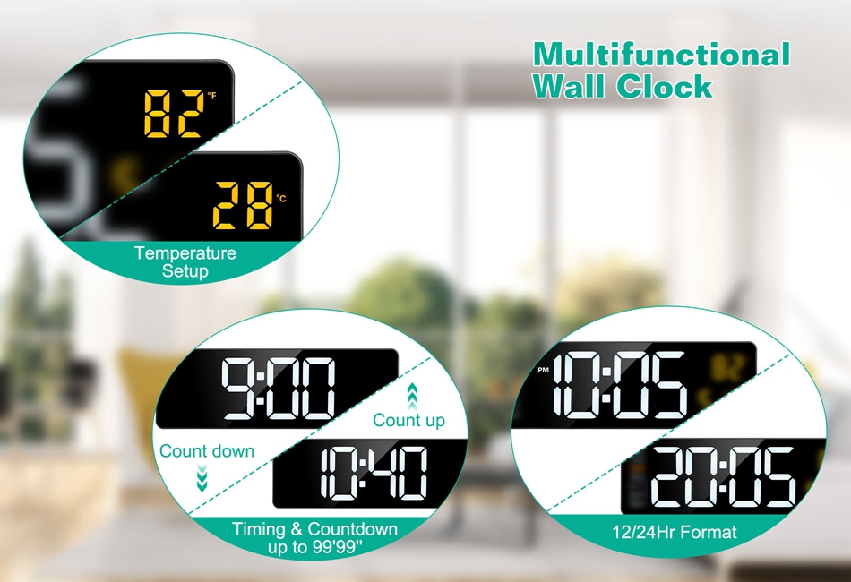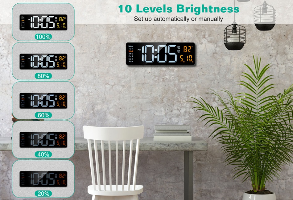 - Automatic Brightness Adjustment:The wall clock can automatically adjust its brightness according to the environmental conditions,which makes it perfect for nighttime reading and all-day and night activities. The LED digital clock features 10 brightness levels. You can easily adjust manually with a remote control.