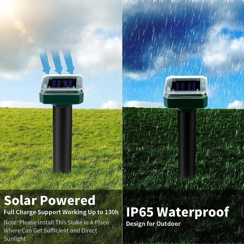 1.Solar Powered: the ultrasonic gopher repellent is equipped with solar panels and rechargeable battery that can absorb sunlight, 4 hours of solar charge in the sun is enough to keep them working for 4 days; It's energy saving and without replacing the battery, mole repellent stakes will emit low frequency of 3-4 seconds every 20 seconds