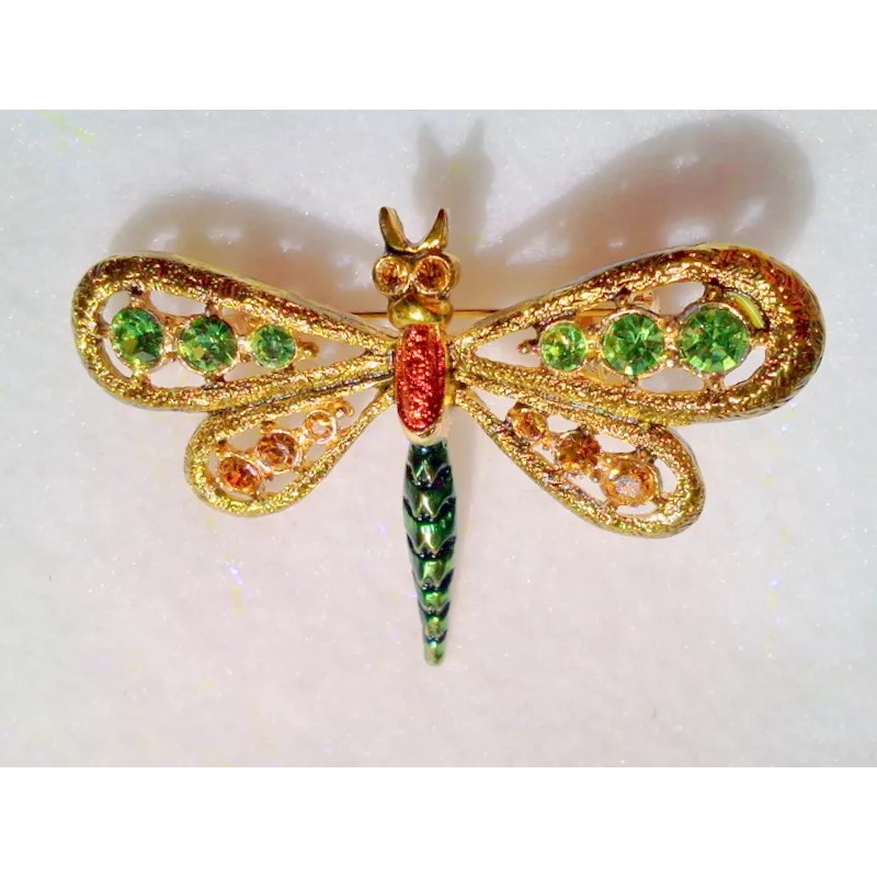 Unbranded 18K GOLD PLATED PERIDOT AND AMBER CRYSTAL DRAGONFLY BROOCH PIN CZECH REP