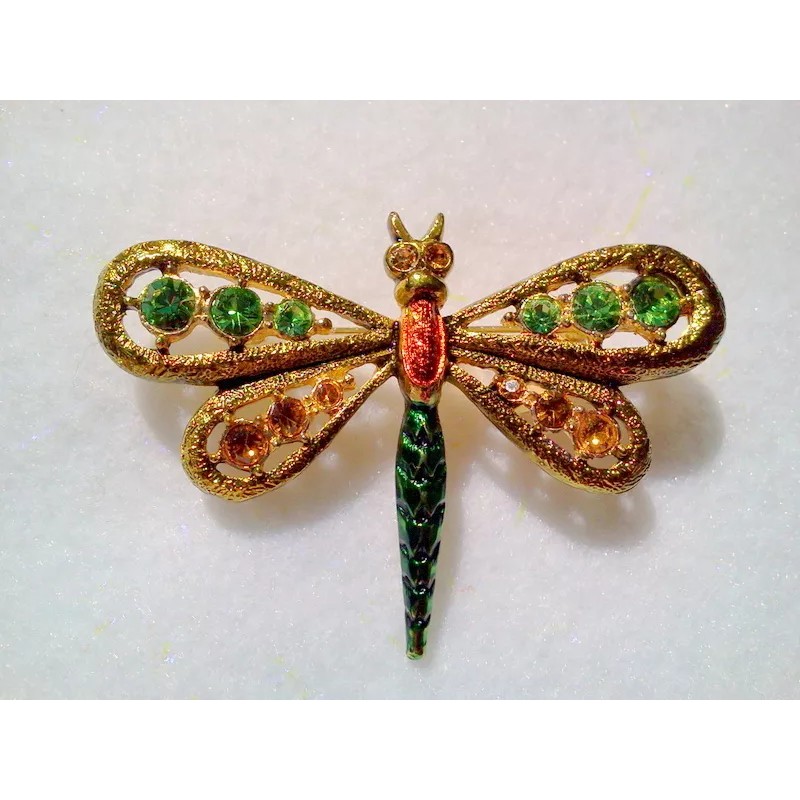 Offering one new dragonfly brooch made in the Czech Republic by our family's factory. It is set with peridot green and amber colored Czech crystals. It is not signed on the back. It measures 1.75" long x 2-3/8" wide. Comes with a metal Czech tag and is packaged for you in a gift box.