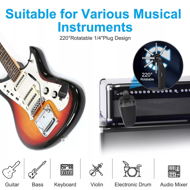 No guitar cables needed, featuring a 220° rotatable plug design, it's compatible with most electric guitars, bass, acoustic guitars, and other digital music instruments.