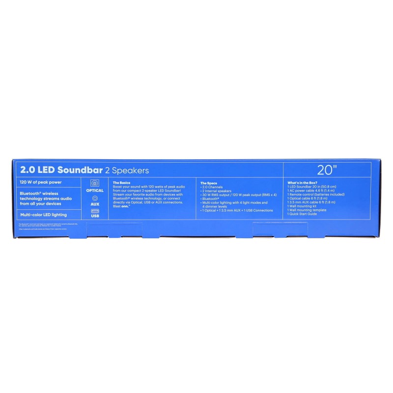 What's in the Box? 1 LED soundbar 20 in (50.8 cm), 1 AC power cable 4.6 ft (1.4 m), 1 remote control (batteries included), 1 Optical cable 6 ft (1.8 m), 1 3.5 mm AUX cable 6 ft (1.8 m), 1 wall mounting kit, 1 wall mounting template, and 1 Quick Start Guide